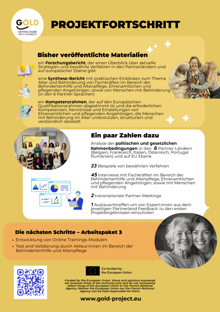 In den letzten Monaten wurden inspirierende Geschichten, Erlebnisse und Praktiken aus allen Partnerländern des GOLD-Projekts zusammengetragen. Anhand der Informationen zu insgesamt 23 bewährten Verfahren und den Ergebnissen aus 45 qualitativen Interviews mit Menschen mit Behinderungen, Fachkräften im Bereich der Behindertenhilfe und Altenpflege sowie Ehrenamtlichen und pflegenden Angehörigen wurde der Schulungsbedarf für Fachkräfte erhoben.